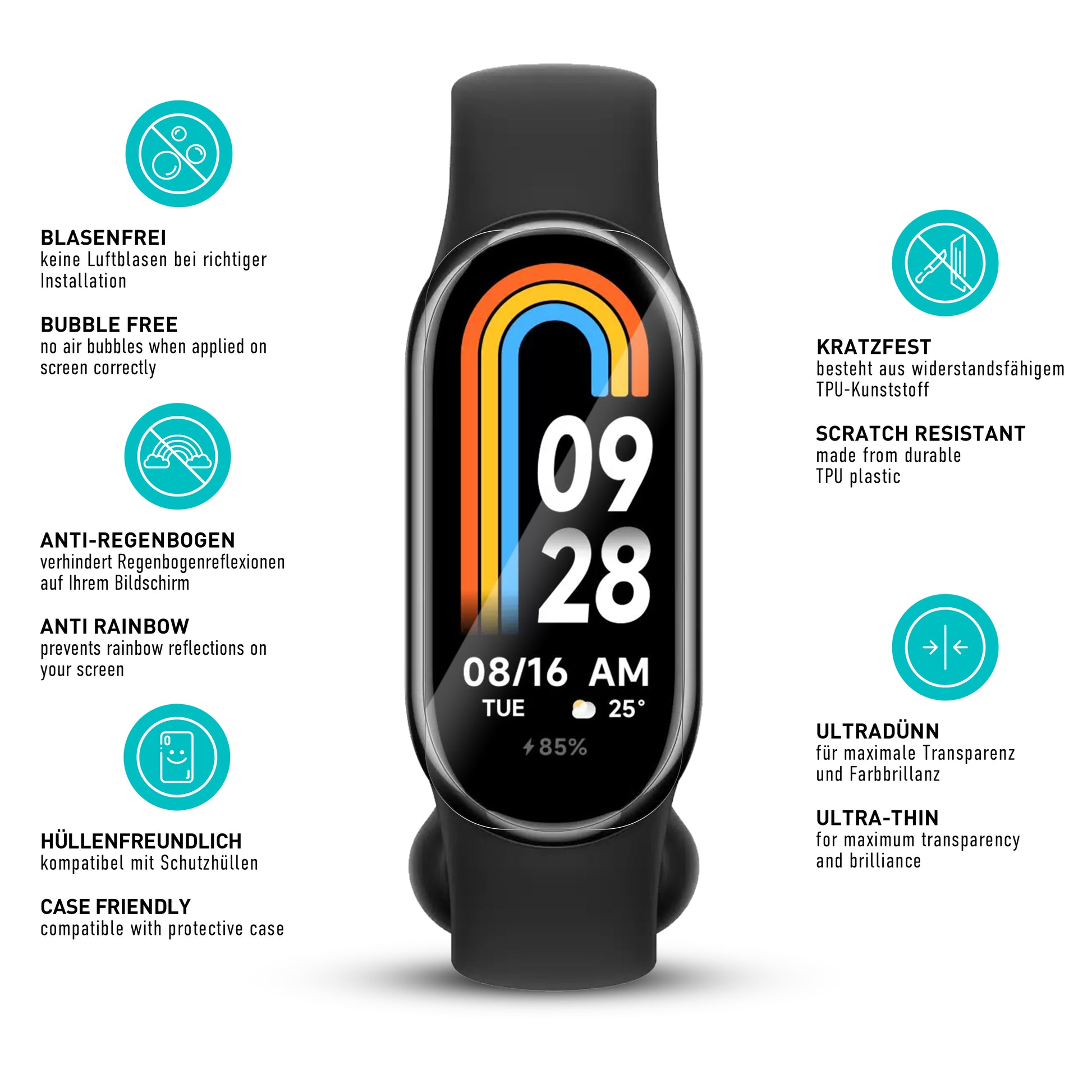 Perfekte Passform: Die ultimative Schutzfolie aus hochwertigem TPU-Kunststoff ist zu 100% kompatibel mit dem Xiaomi Smart Band 9. Dank einer speziellen oleophoben Beschichtung lassen sich Schmutz, Fettschlieren und Fingerabdrücke mit einem einzigen Wisch mühelos entfernen, wodurch ihr Display stets sauber und klar bleibt.